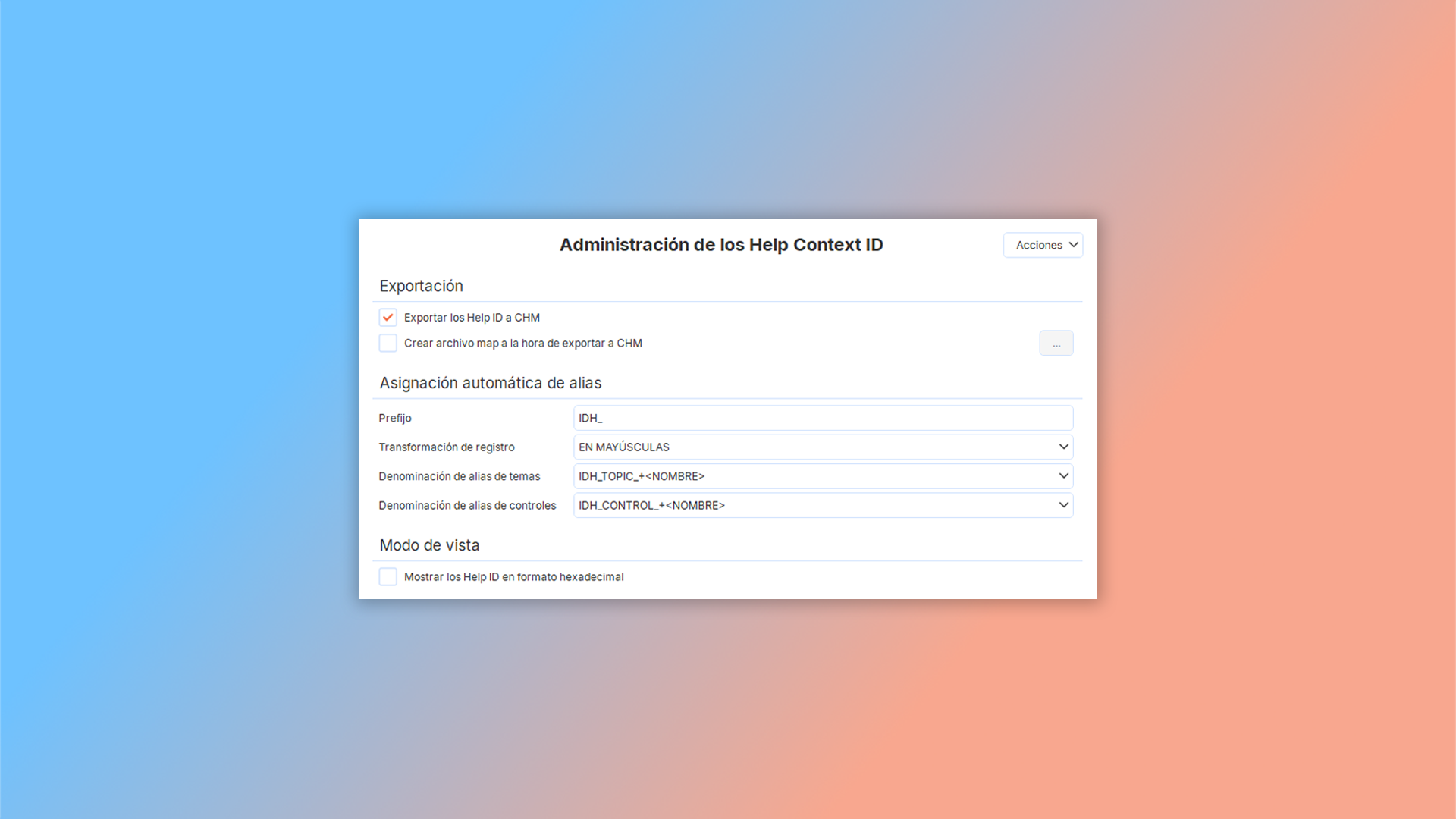 A continuación, navegue hasta Exportación CHM → Gestión de ID de contexto de ayuda.