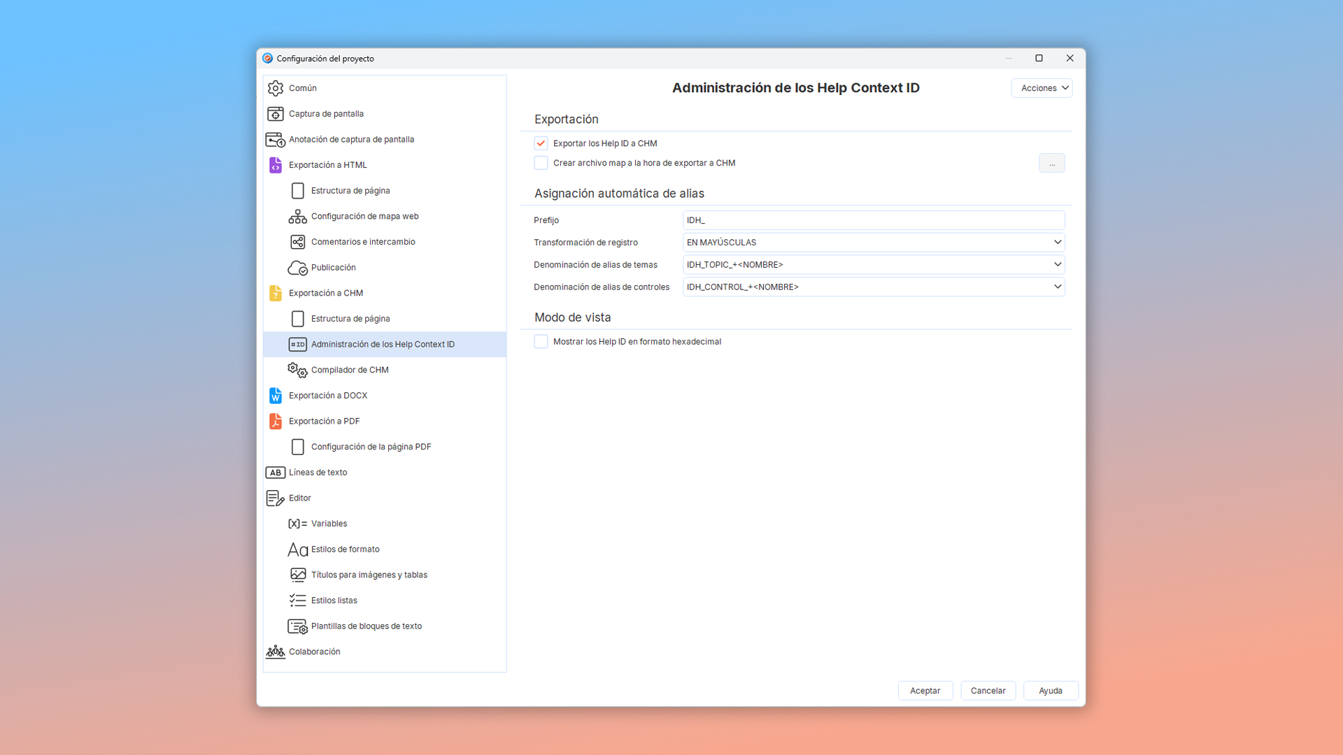 Para configurar los ajustes de ID de contexto de ayuda para la exportación CHM en su proyecto actual: